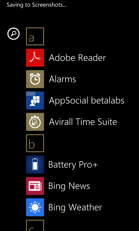 Swipe to the right of the Start screen and you’ll see the app list, which is listed alphabetically (you can’t change this). Once enough apps are installed, the apps will be grouped according to their alphabet, with a small alphabet tile at the top of each group. Tapping on the tile will allow you to jump to a specific alphabet. It’s really fast and intuitive and in my opinion better than the alphabet side-scrolling seen on Android and iOS.